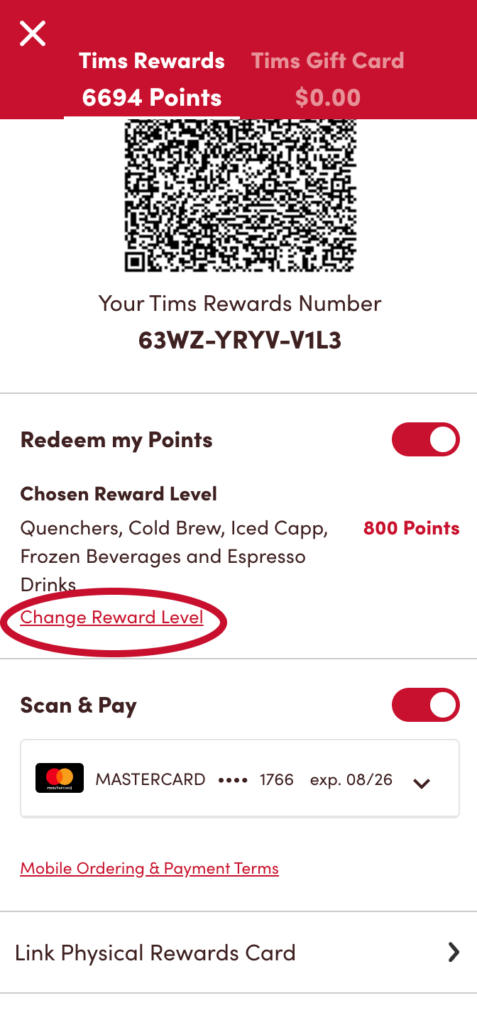 If you’re in a Tim Hortons restaurant and would like to change your Reward Level, please do it before you get to the counter to ensure that your preference updates in time.