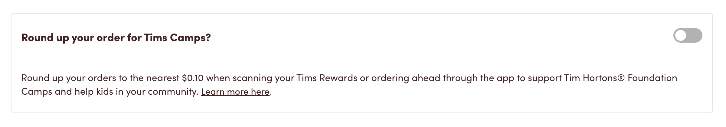 3. On the ‘Details’ tab, tap the ‘Round Up for Tim Hortons Foundation Camps’ button to turn it on or off.