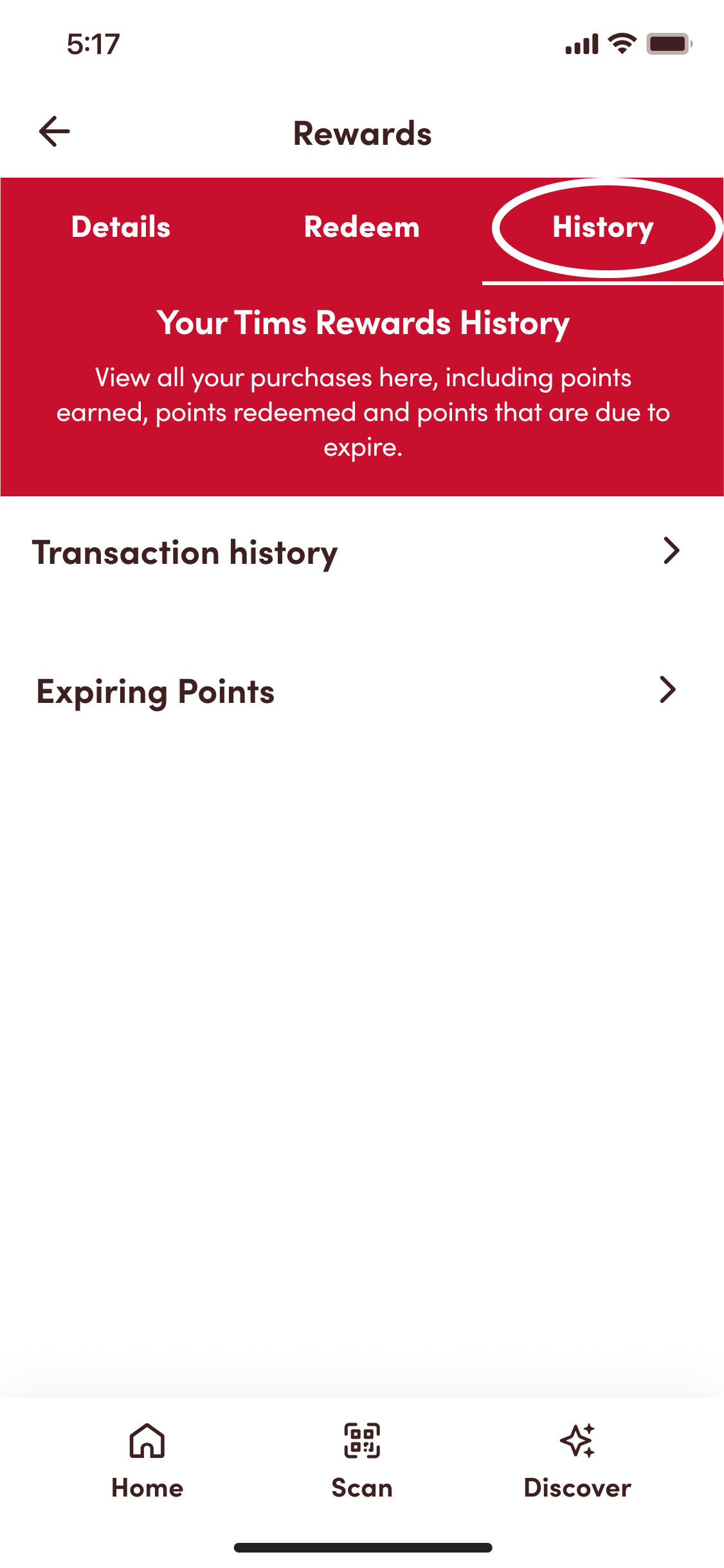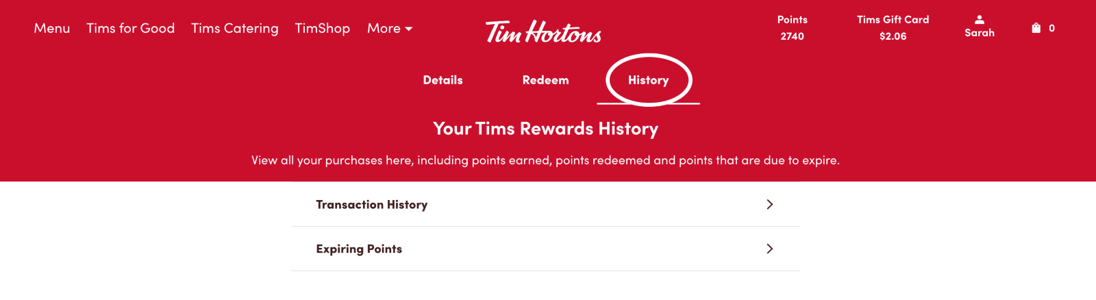 3. Select the ‘History’ tab, where you’ll have the option to view both your ‘Transaction history’ and ‘Expiring points’.