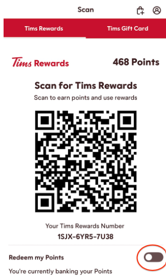 To save your points, turn off ‘Redeem my points’ in the Tims app. You can do this from the ‘Scan’ page, or the ‘Redeem’ tab of the ‘Rewards’ page.