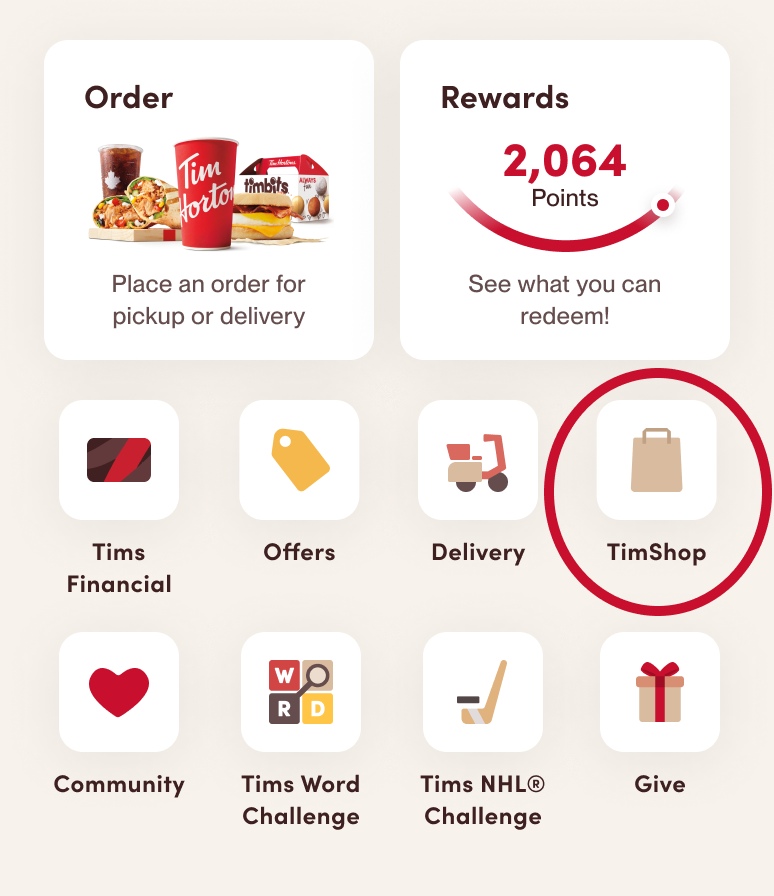 You can access TimShop through the Tim Hortons app or by visiting Timshop.ca.