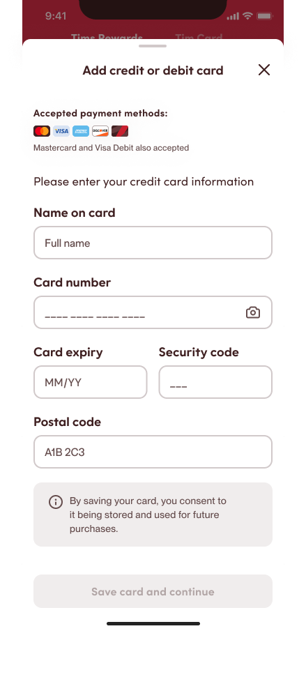 When you want to use Scan & Pay, simply open the Tims app and present your QR code to be scanned at the register. Your order will be charged to the payment method you selected, and you’ll earn 10 points per $1 you spent.