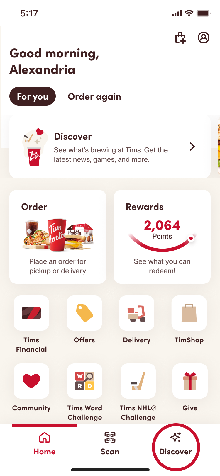 The ‘Discover’ page is where you can find all the new exciting things from Tims. This is your go-to place for contests, offers, games, promotions, and features to explore!