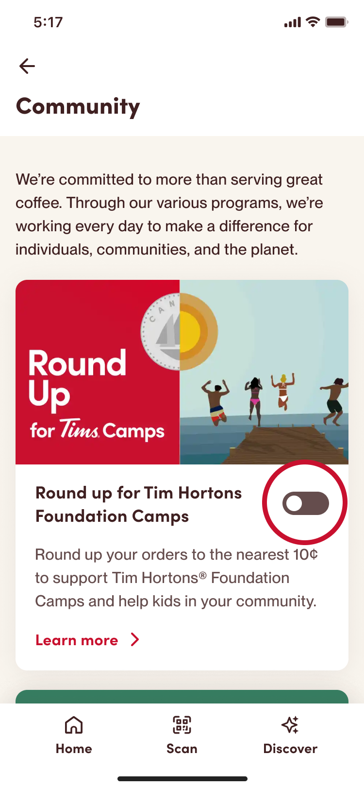 When Round Up is turned on, donations will be automatically added to your order whenever you scan for rewards or order through the Tims app.