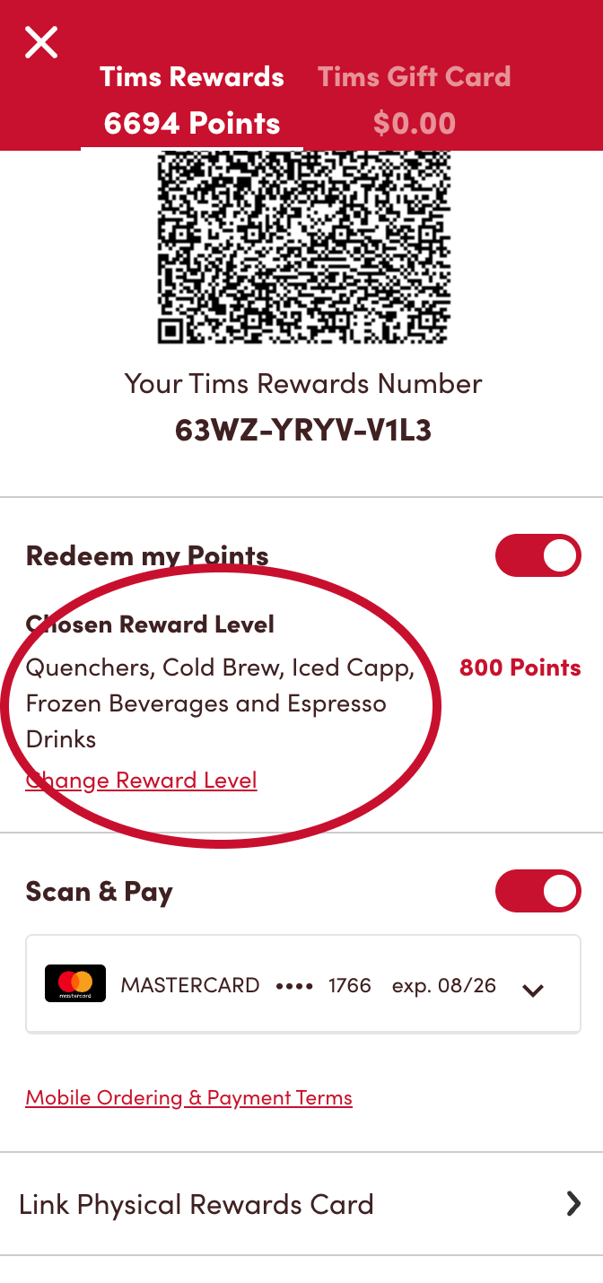 Si vous utilisez une carte de physique FidéliTim, celle-ci doit être associée à votre compte Tim Hortons.