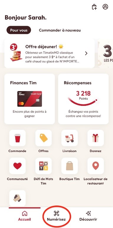 2. Dans l’onglet FidéliTim, numérisez votre code QR FidéliTim à la caisse avant de payer.