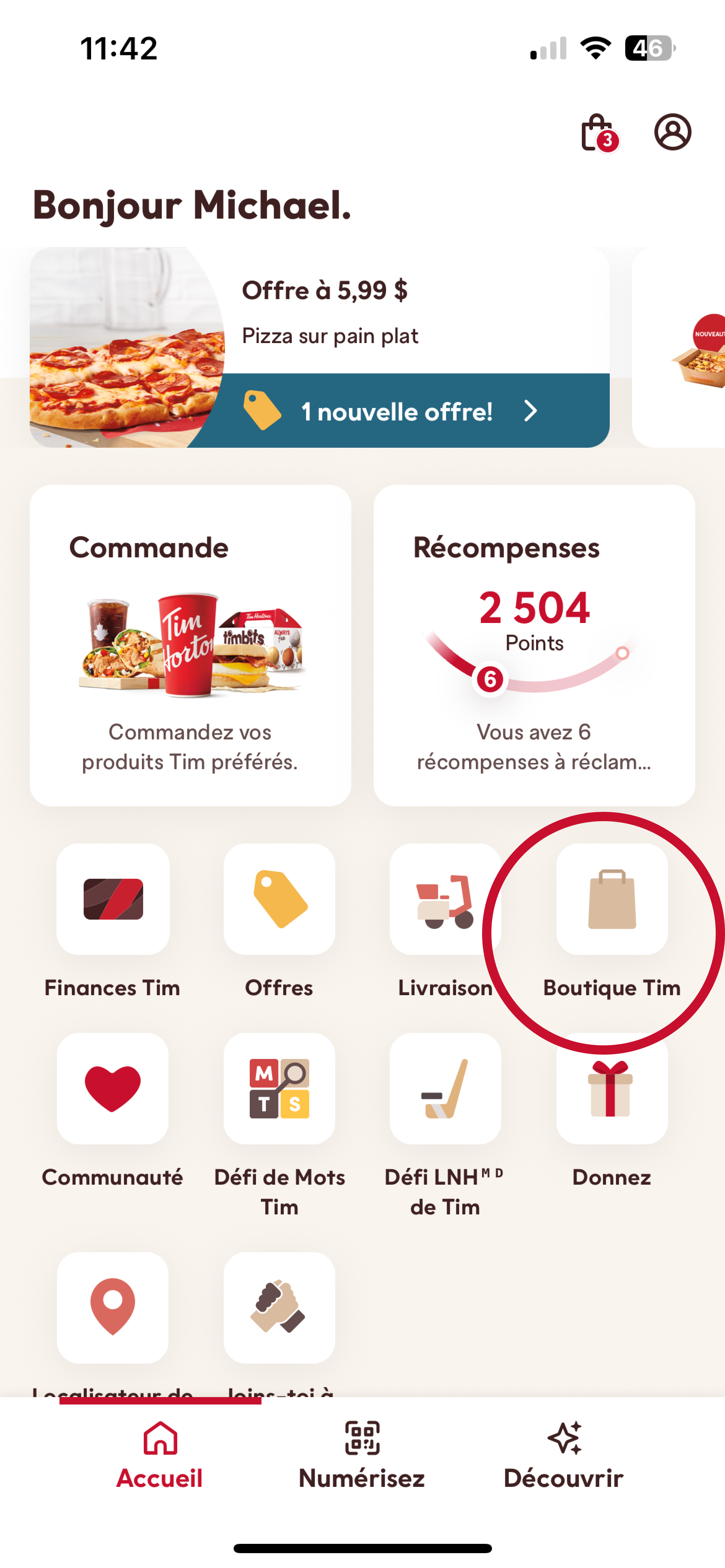 Vous pouvez accéder à la Boutique Tim par l’entremise de l’appli Tim ou en visitant le BoutiqueTim.ca.