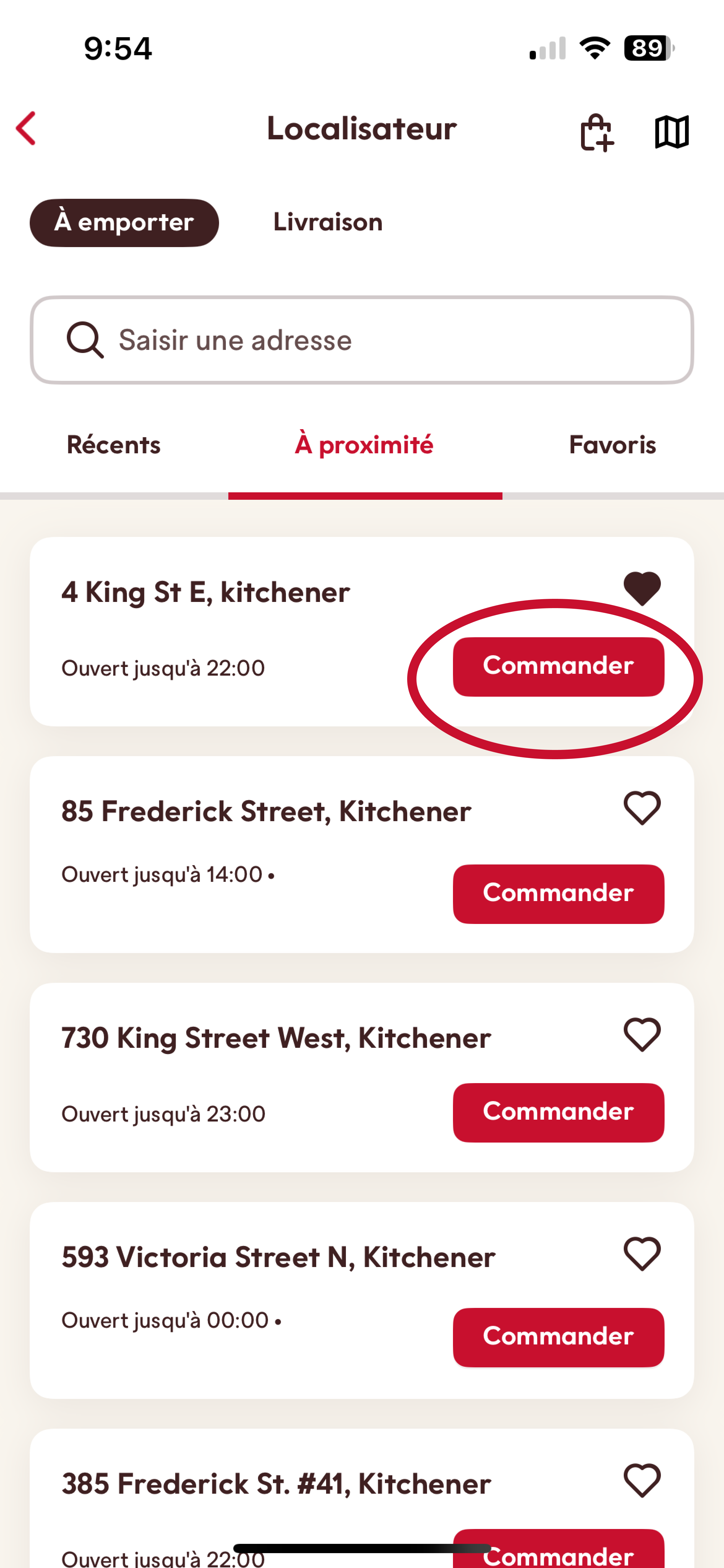 3. Sélectionnez le bouton rouge « Commander » à droite du restaurant où vous souhaitez passer votre commande.