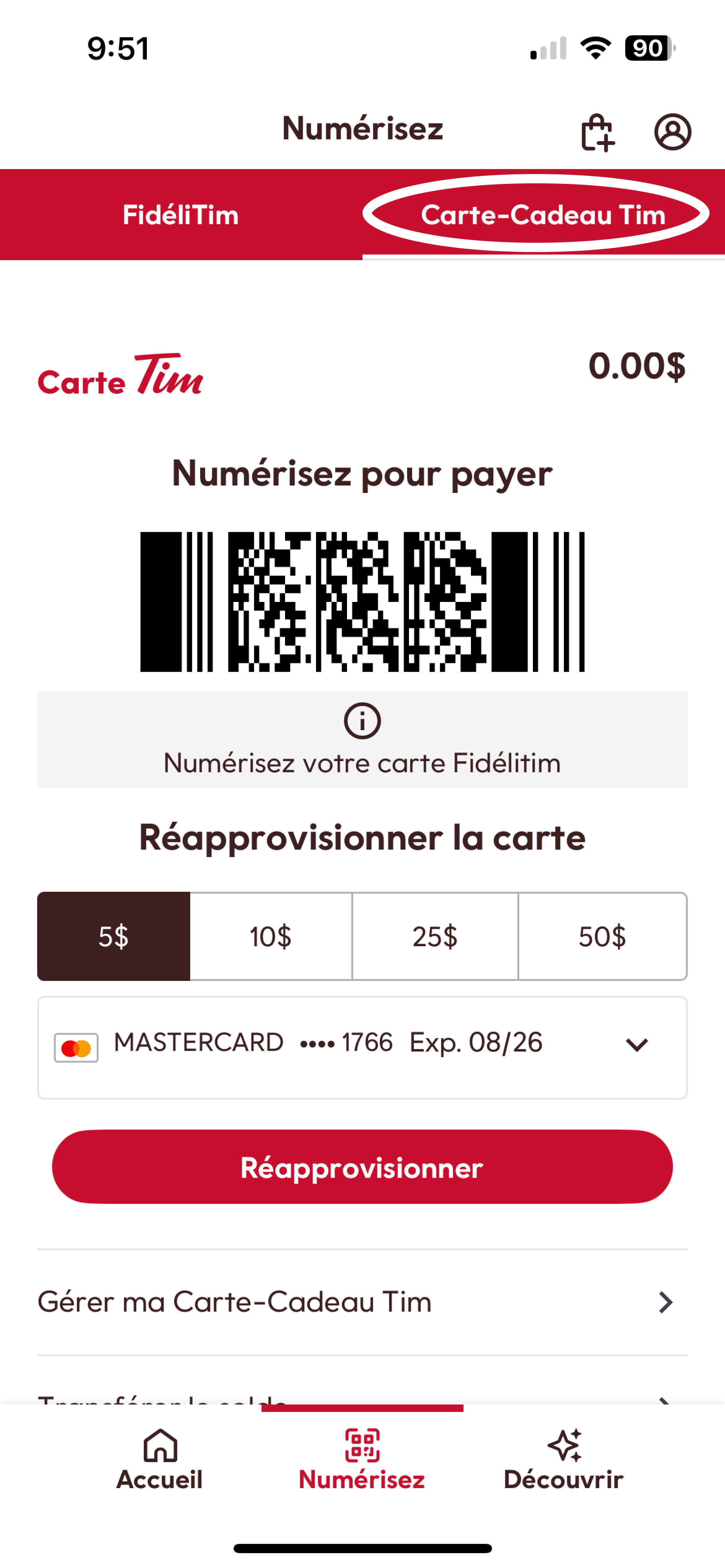 Si vous avez choisi votre Carte-cadeau Tim comme mode de paiement par défaut pour vos commandes mobiles, l’appli vous demandera de réapprovisionner votre carte si le solde est trop bas pour payer votre commande.