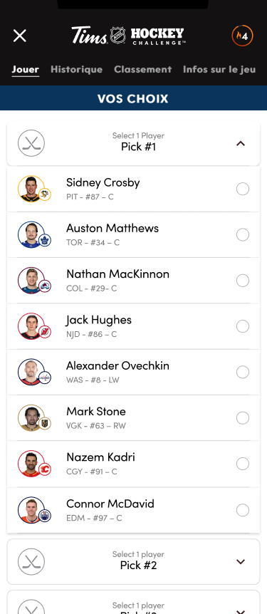 Vous devez faire vos choix parmi les joueurs sélectionnés pour le Défi de hockey de la LNH de Tim le jour d’un match. Vous ne pouvez pas faire des choix personnalisés. Vous devez sélectionner un choix dans chacun des trois groupes de joueurs, puis soumettre vos choix.